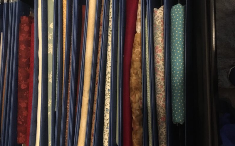 If you’re anything like me, you’ve got multiple stacks of fabric, and they’re all over the place. Well, recently, I decided it was time to see what I had, and figure out a way to organize it so I could find it easily. Stacking in clear plastic bins is one great way to go, especially if you’re talking about large amounts of each fabric style. But for me, working mostly with cottons and lighter materials in increments of less than 5 yards each, I wanted to come up with something a bit easier to view. And then it hit me — why not repurpose some older file cabinets with hanging pendaflex file folders, and store my fabric that way? I can see the fabric at a quick glance, and also know when I’m running low on a style I need to keep on hand. Like magic, I felt organized and efficient, and it didn’t cost a cent!